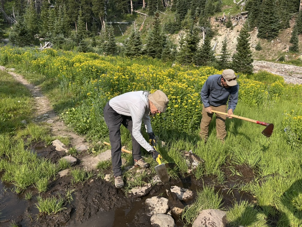 Back at camp we met Roy and Tyler, and they agreed to use the new route up the meadow. They were very appreciative of our work, and carried some heavier tools back down. On our way, we did yet more brush lopping and drainage improvements.