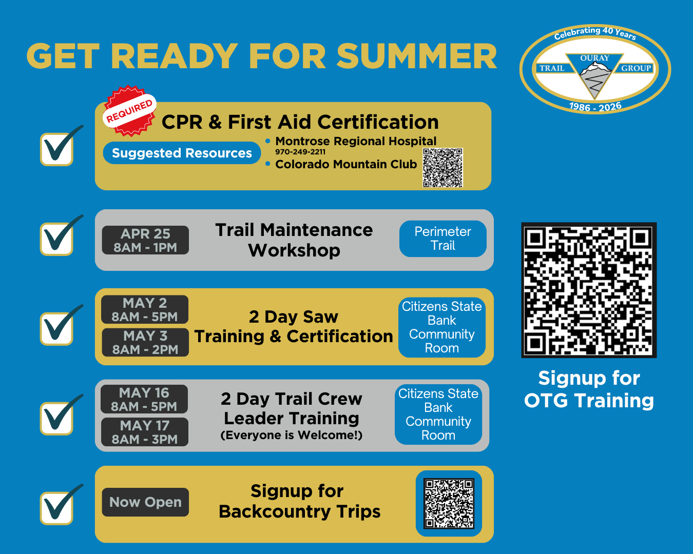 This year marks the 40th anniversary of the Ouray Trail Group, an organization founded in 1986 by a small group of locals who shared a love for the outdoors and a desire to protect and improve access to Ouray’s trails. Much of this history has been thoughtfully documented by Karen Risch, whose writing captures both the milestones and the people behind the organization. What began as a grassroots effort has grown into a long-standing tradition of stewardship, volunteerism, and community involvement. Click here to read her full article.