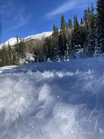 Where and when can I see it? First of all, it needs to be very cold so the crystals have formed but not melted – that means early morning or a very cold air. Clear, still nights lead to the best conditions – lots of radiational cooling. Also, you will most likely see it near areas where there is a nearby open stream (more moisture), but you do also see it where the moisture could be coming up from the internal snowpack. No wind is important both for keeping it cooler (no mixing) and not breaking the crystals. Get out and explore and enjoy!